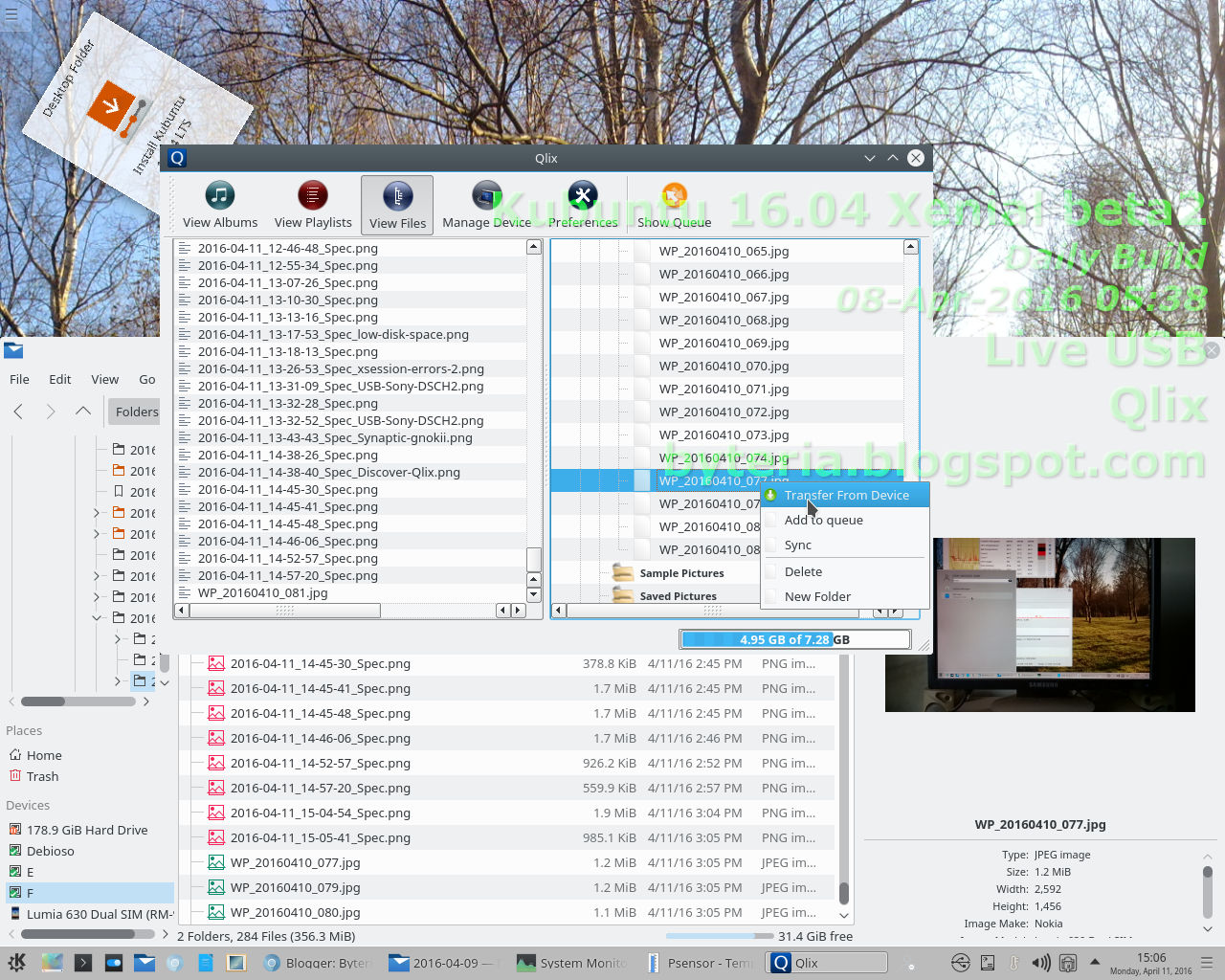 Qlix foi a única solução encontrada para acessar fotos (e demais arquivos) do WindowsPhone Nokia Lumia durante a sessão Live USB do Kubuntu 16.04 Xenial beta2.