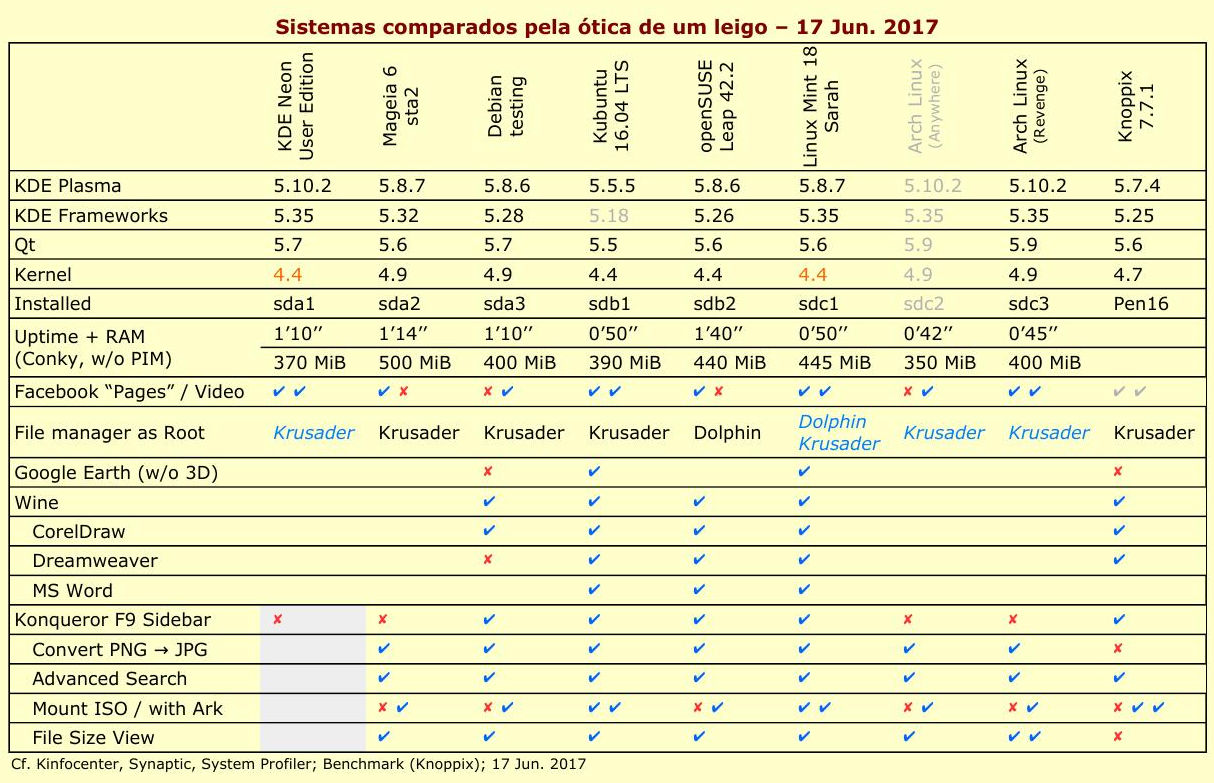 Comparativo das funcionalidades já obtidas nos diversos sistemas Linux instalados