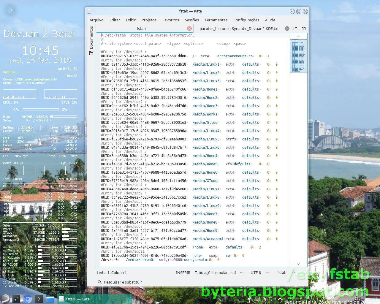 | Arquivo /etc/fstab com as partições adicionadas pelo Disk Manager |